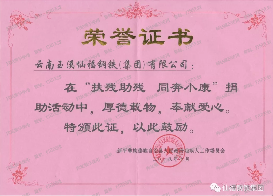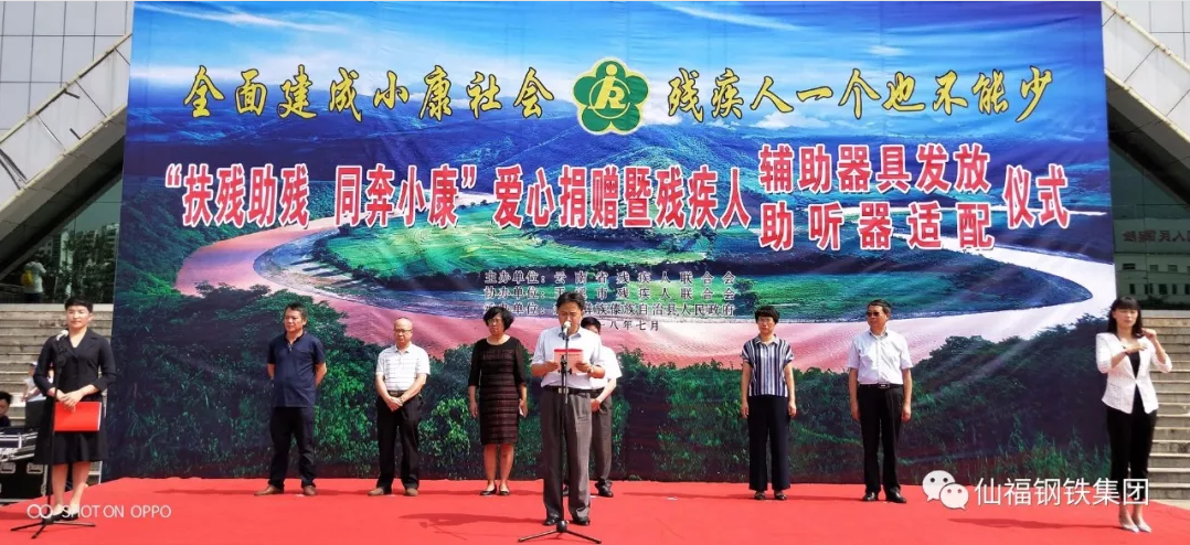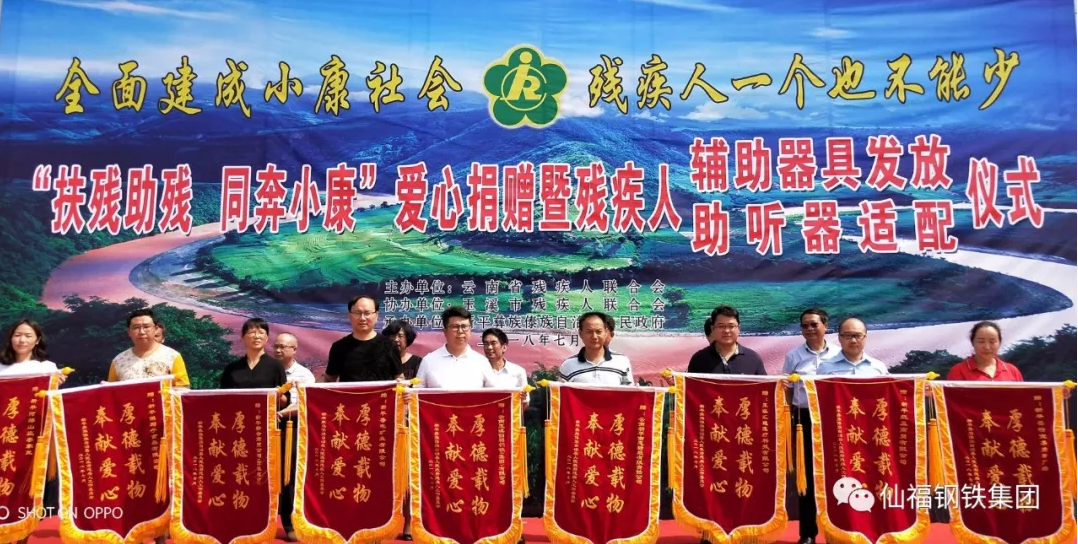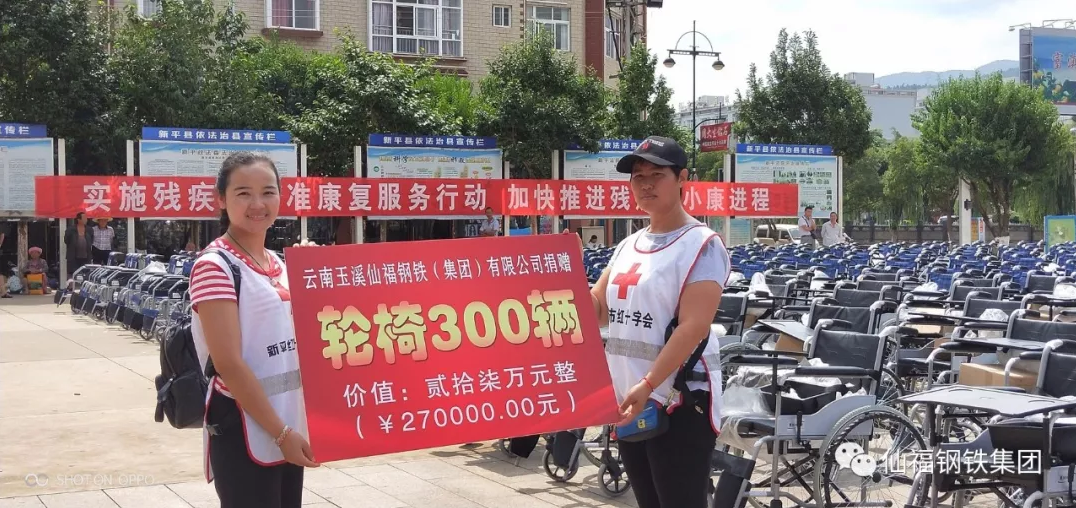 2018年7月23日,云南玉溪仙福鋼鐵(集團(tuán))有限公司在新平縣人民政府主辦的“扶殘助殘 同奔小康”活動(dòng)上向新平縣殘疾人捐贈(zèng)300輛輪椅,捐贈(zèng)儀式在新平縣體育廣場(chǎng)舉行。